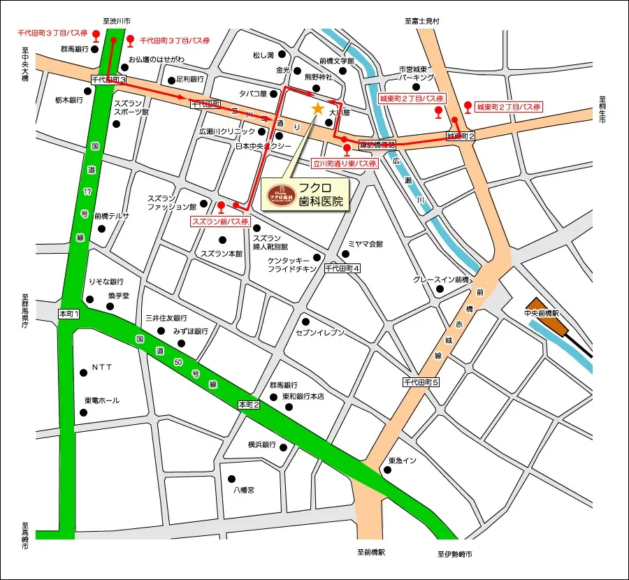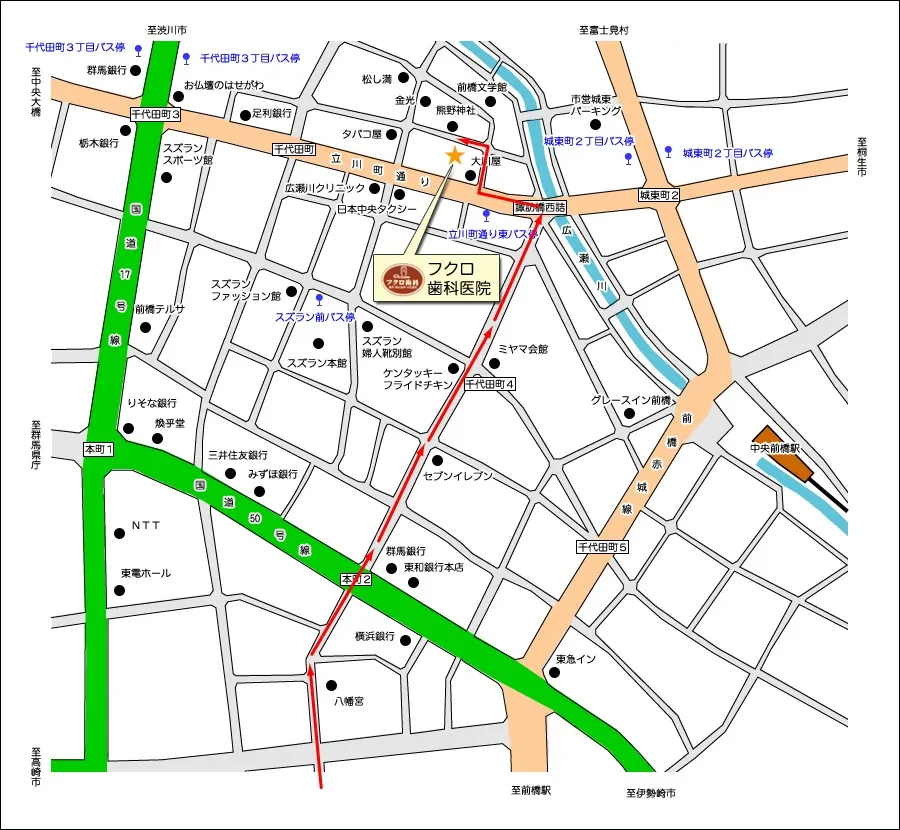 JR前橋駅より「公営バス」または「マイバス」をご利用ください。各バス停からは、バス停からの地図を参照の上、徒歩にてご来院ください。