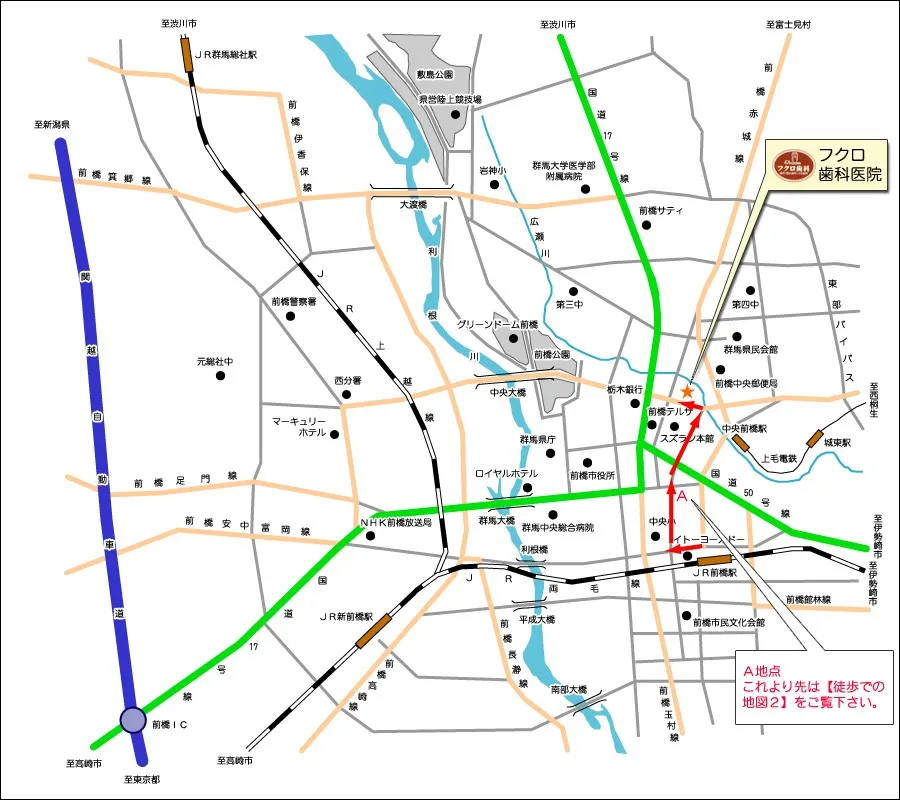 JR前橋駅からの「徒歩での地図1」、JR前橋駅からの「徒歩での地図2」をご参照の上、ご来院ください。