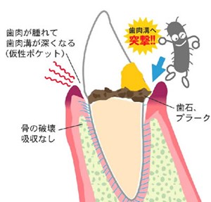 ことなどから考えられています。 現在では歯周病にかかりやすい(遺伝的素因をもっていたり、感受性のある)人が、喫煙やストレスなどの生体防御機能に影響を与えるような条件の下で歯周病細菌を直接の原因として発症するのでないかと考えられています。しかしながら、今だに歯周病の本当の発生機序は分かっていません。ポケット内が汚くなるにしたがって出てくる偏性嫌気性菌に対応して好中球がH2O2やSODを出す。これがHO(ヒドロキシラジカル)を作ってしまい、上皮細胞を殺傷するため、歯周病が起こる。というのが現在における仮説です(難しいですね)。つまり細菌は原因ではなく、関与したのみで、宿主・環境が変化したのが一番の原因であるので、そこを変えるのが治療法に繋がると思われます。
