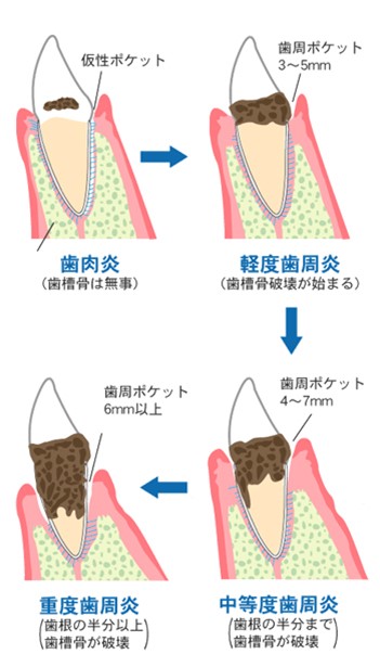 歯周病に感染されている多くの患者様が、前橋市フクロ歯科医院の治療の流れに沿って、個々の患者様の状態などに合わせて治療を進めております。歯周病は、歯肉炎(歯肉が赤く腫れた状態で歯槽骨まだ吸収していない)の形で始まります。それが病態の進行とともに歯槽骨を溶かしていき、歯周病が成立します。その症状に応じて軽度から重度までを分類しています。