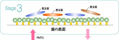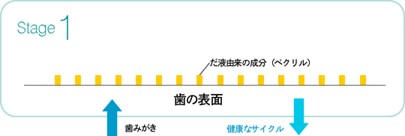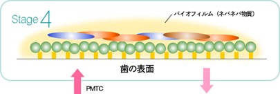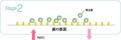 歯の表面に善玉菌(歯周病の原因菌でないもの)がついた状態。 ここで歯にくっつくのは球菌といわれる細菌で、水溶性のバイオフィルムを作る状態。 つまり簡単に歯ブラシでも除去できます。この状態が健全な歯垢です。