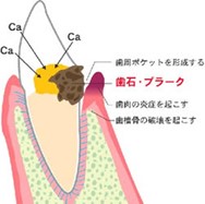 従来、歯石そのものに病原性はなくても、その表面はざらざらしており、歯垢がその上にのりやすくなるため病原性が高くなるとされてきました。しかし現在は、歯肉溝浸出液の外部に流れる流れを止めてしまう物理的な障壁としての病原性が唱えられています。これはかぶせ物の冠のオーバーマージン(冠のはじの部分が延びすぎている場合)でも同様のことが言えます。つまり、これらが歯肉溝浸出液の流れを止めるため、ポケット内に本来流れ出すはずのグラム陰性桿菌が多く停滞してポケット内が汚れてきて、それらが炎症を起こしていくという考えです。ダムが出来たために清流の流れが止まり、鮎などの川魚が死んで腐敗臭がしている状態と同じです(ドブ掃除が必要なわけです)。