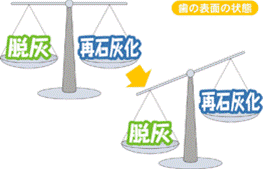 口の中では、酸が歯を溶かす「脱灰」と歯を守る「再石灰化」が同時に行われていて、このバランスがとれていれば歯は健康です。ところが何かの原因で歯を溶かす作用が強くなると、歯の表面からカルシウム分がどんどん溶け出してむし歯が始まります。しかし、むし歯になりかかっていても、むやみに削らずに、フッ素を使用したり、唾液の分泌をよくするなど、再石灰化を促す努力をすれば、むし歯の進行を止め元の状態に回復させることができます。