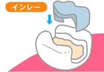 インレー(inlay)は、窩洞(虫歯を削った後の穴)にはめ込む詰め物です。なお、インレーと同様の詰め物だが、咬頭頂を超え歯冠の大部分を覆うものを特にアンレー(onlay)といい、通常のインレーより強度が必要になります。一般的には、金属でできたインレーが広く使われています。健康保険でつくられるのは、金12%、銀50%、Pd(パラジウム)20%、銅17%で出来ている金属インレーです。強度は高く割れにくいのですが、長期的には変形を起こし、歯との間に隙間が生まれ、2次カリエス(むし歯の再発)を起こす可能性が高いとされています。色も銀色(金合金では金色)で、審美性が悪いです。また、長期的には錆びて溶出し、金属アレルギーを起こすことがあります。熱伝導性も高いので、熱い、または冷たい飲食物に対し過敏になることがあります。適合はそこそこですが、やや堅い材料です。展延性がないので、辺縁部を伸ばして合わせるということはできません。対合する歯にアマルガム充填があると電流が起こる(ガルバーニ)ため、咬む度に痛いと訴える方もいますので、その場合にはプラスチック(レジン)や自費治療のオールセラミックなどに交換されたほうが良いと思います。
