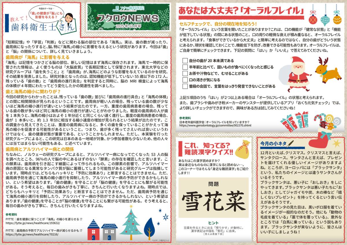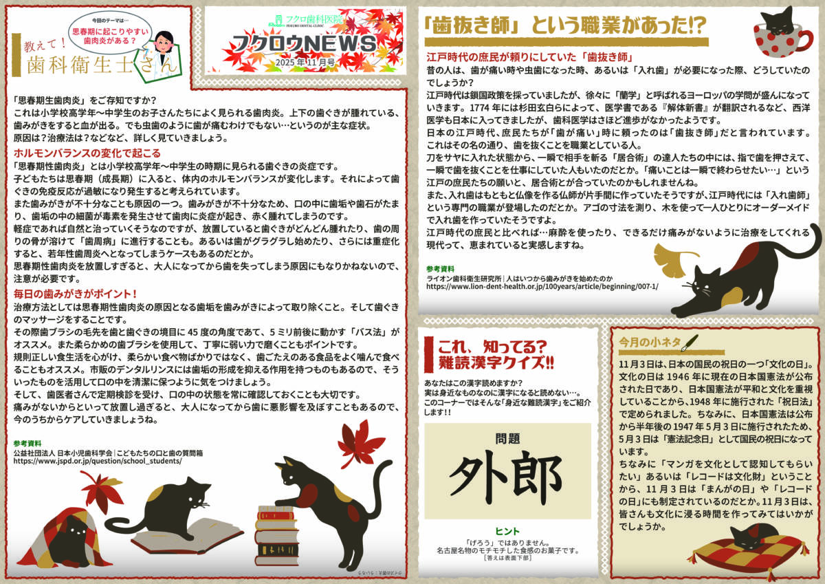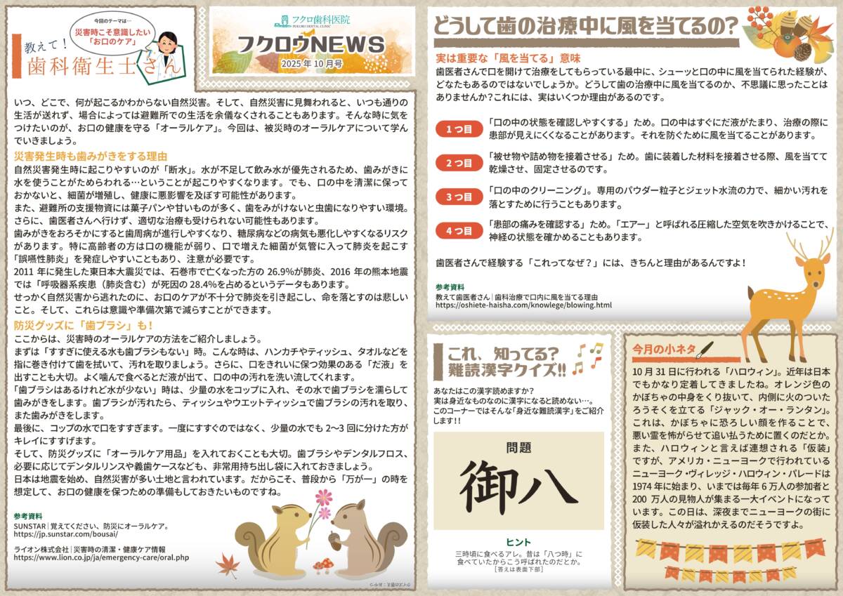 フクロ歯科医院をみなさんにもっと知っていただくために「フクロウニュース」を発行しています。歯科に関する話や、院長・スタッフの紹介など、裏の裏までお見せしたいと思います。どうぞご期待ください!